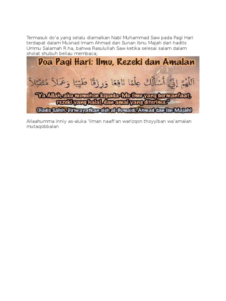 Doa pagi hari yang diajarkan rasulullah sallallahu alaihi wa sallam saw merupakan kebaikan besar yang terlalaikan. Allhm eny asalk aalma nafaaa orzka tyba oaamla. Termasuk doa yang selalu diamalkan nabi muhammad saw pada pagi hari yaitu yang terdapat dalam musnad imam ahmad dan sunan ibnu majah dari hadits ummu salamah rha bahwa rasulullah saw ketika selesai salam dalam sholat shubuh beliau membaca.