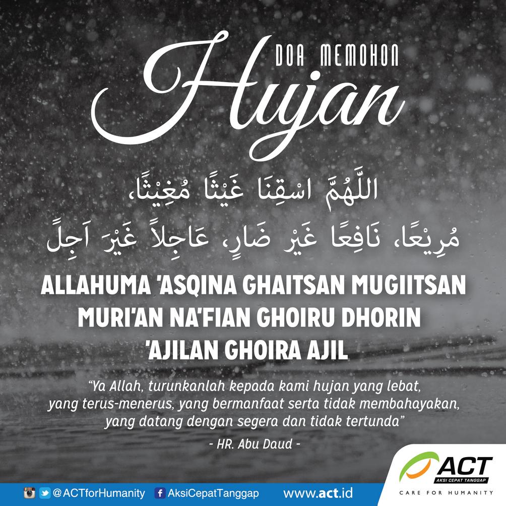 Bacaan doa ketika musim hujan datang lengkap arab latin artinya hujan yang turun ke bumi ini ada banyak manfaat yang diterima oleh makhluk ciptaan nya dengan adanya hujan yang turun ini alah menyuburkan tanaman tanaman yang diperlukan oleh manusia dan makhluk lainnya ada pepohonan yang rindang serta tanaman buah yang dibutuhkan manusia untuk kesehatannya. Tetapi keadaan hujan kadang kala membuat alam sekitar kelihatan gelap dan dikelilingi oleh kilat angin dan kilat yang menjadikan hujan sebagai sumber kecemasan bagi. Didalam al quran semua umat manusia diperintahkan untuk selalu berdoa kepada allah agar mendapatkan rezeki kesehatan dan panjang umur.
