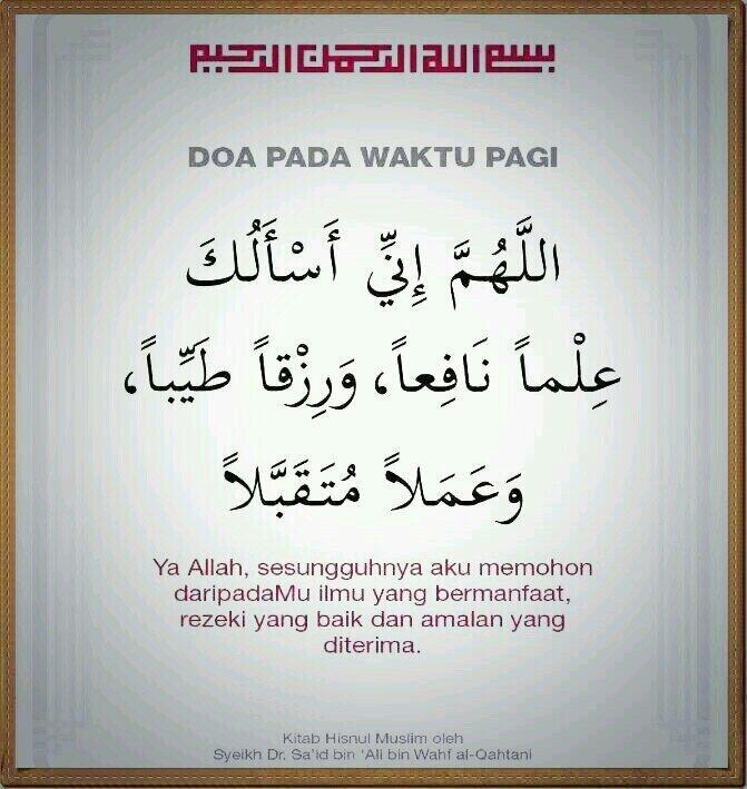 Mohon ilmu rezeki dan amal yang diterima. Doa pagi pagi hari merupakan awal dari segala aktifitas serta rutinitas manusia sehari hari terlebih lagi jika rutinitas itu adalah bekerja ataupun menuntut ilmu sebab bekerja mencari rejeki halal termasuk ibadah karna menjadi salah satu perintah alloh yaitu pada qs. Sedangkan pada sore hari kebanyakan orang berhenti dari aktifitas dengan kembali ke tempat tinggalnya untuk beristirahat.