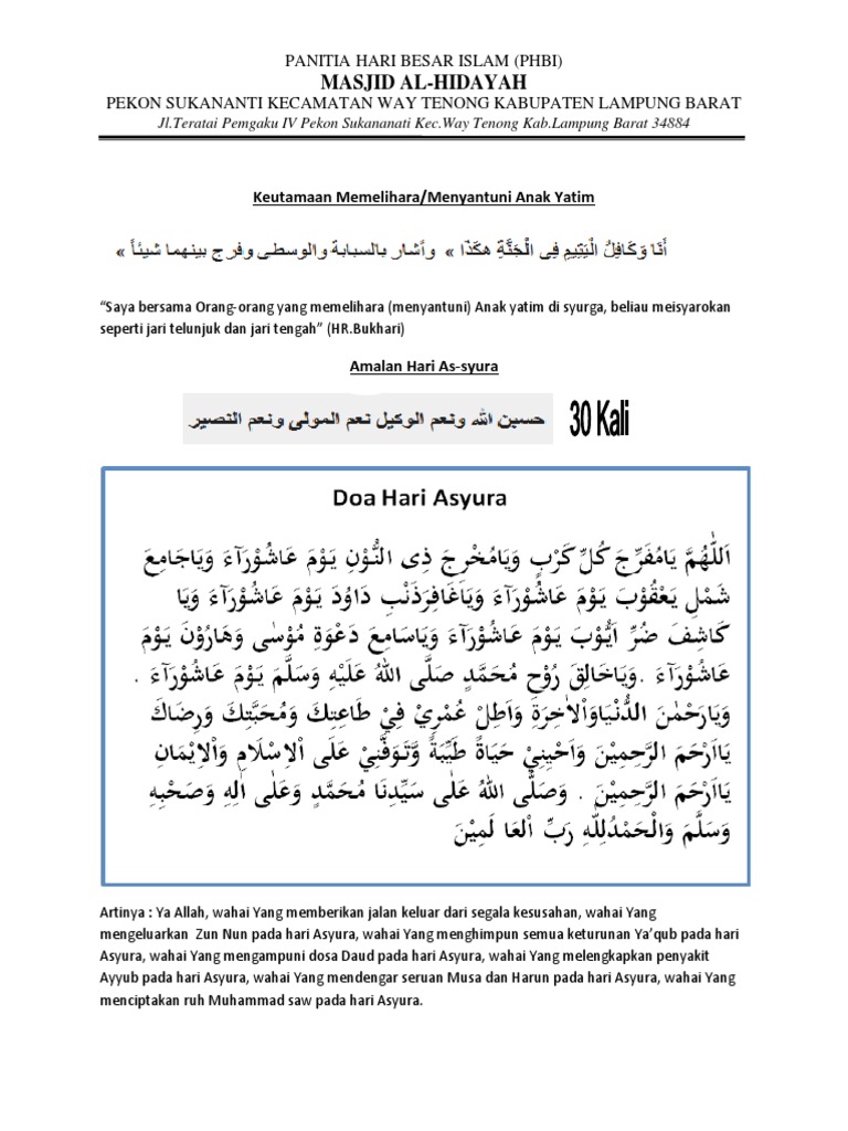 Doa hari asyura dan terjemahannya. Tahlilan merupakan ritual pembacaan lafal tahlil yang lazim di masyarakat nusantara sejak ratusan tahun. Al allamah al dairobi dan sayid muhammad al amir menukil keterangan imam al ajhuri yang mengatakan bahwa barang siapa yang pada malam atau hari asyura membaca wirid hsbna allh onaam alokyl naam almol. Jika orang tersebut ajalnya sudah dekat maka ia tidak ada kesempatan membaca doa doa tersebut.